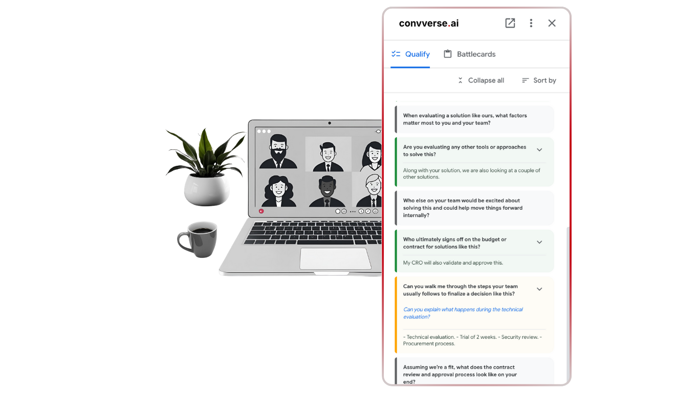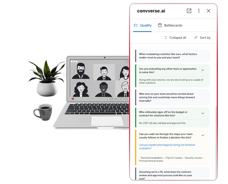 convverse.ai is a Chrome extension for Google Meet that gives sales reps real-time prompts to ask the right questions and answer customer objections live.