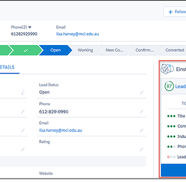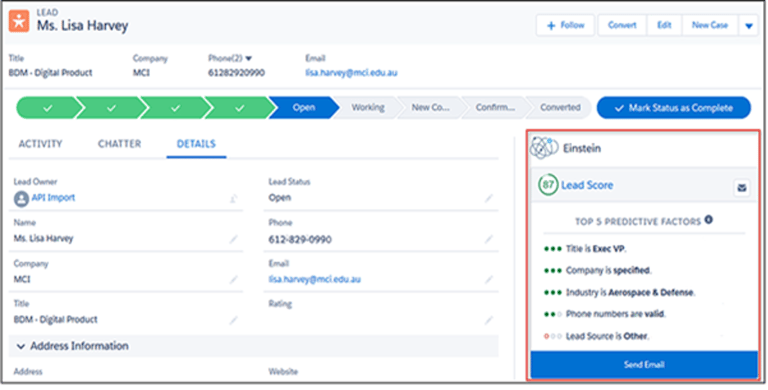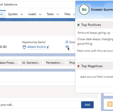 Salesforce Einstein Opportunity Scoring uses machine learning to assess all your open deals and assigns each an opportunity score (1–99) based on the likelihood of closing.