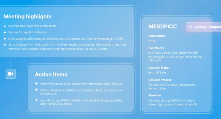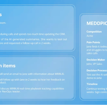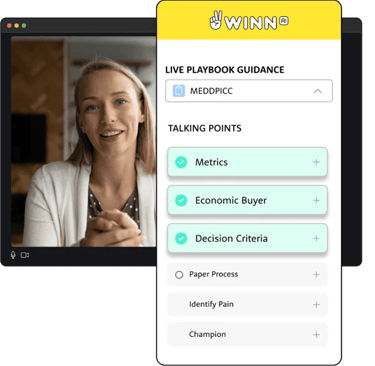 Winn.AI acts as your personal meeting co-pilot. It joins your sales calls, automatically captures key details, and updates CRM fields while guiding reps through playbook-led frameworks such as BANT, MEDDPICC, or SPIN Selling — all without disrupting the natural flow of the conversation.