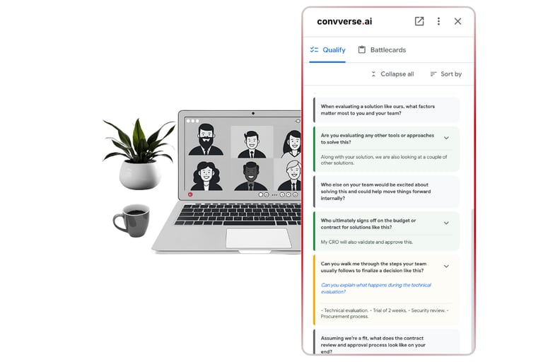convverse.ai is a real-time sales assistant built to listen, analyze, and empower reps during every conversation. Integrated with platforms like Google Meet and Microsoft Teams, it provides live guidance, question frameworks, and AI-driven battlecards — enabling reps to qualify faster and respond to complex queries with confidence.
